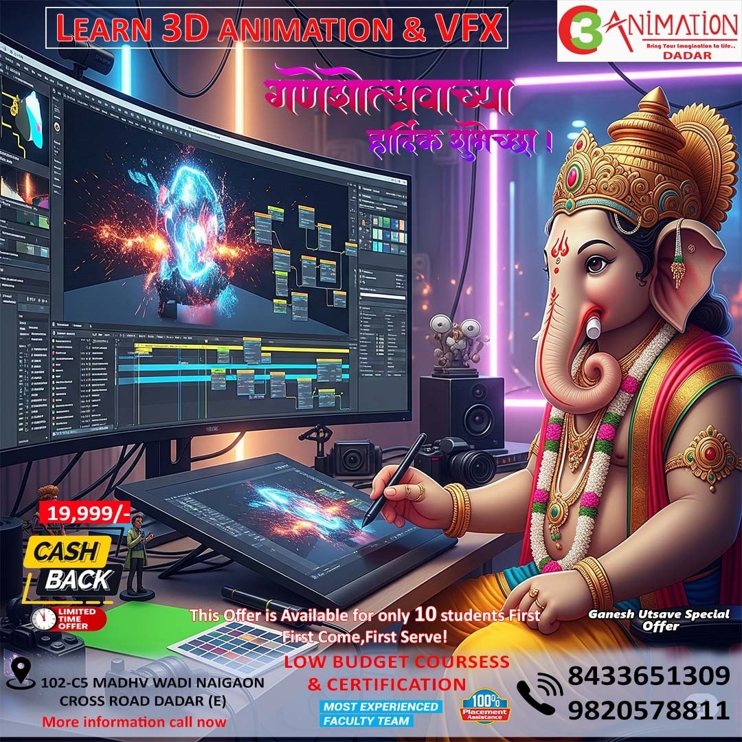 This Ganesh Chaturthi, let creativity be your blessing! ✨ Learn 3D Animation & VFX and shape your future in the world of imagination. Special Offer for ONLY 10 Students – First Come, First Serve! Don’t miss the chance to start your creative journey.